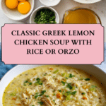 A classic Greek Avgolemono soup featuring tender chicken simmered in flavorful broth with rice or orzo, brightened by lemon and enriched with eggs for a silky, creamy texture without any cream. This comforting and nourishing soup is perfect as a warming appetizer or light meal.