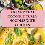 Rich and creamy Northern Thai coconut curry noodle soup with tender chicken, aromatic spices, and a crispy noodle topping. This comforting and flavorful dish combines savory curry broth with soft egg noodles and vibrant garnishes, perfect for a satisfying dinner.