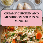 A rich and comforting creamy chicken and mushroom soup featuring tender shredded chicken, earthy mushrooms, and a smooth, flavorful broth. This hearty soup is perfect for cozy meals and easy weeknight dinners.