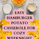 A cozy, old-fashioned hamburger potato casserole featuring tender, thinly sliced potatoes layered with savory ground beef and onions, all smothered in a creamy mushroom sauce and topped with melted cheddar cheese. This hearty and satisfying dish is perfect for a comforting family dinner.