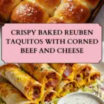 A creative fusion dish combining the bold flavors of a classic Reuben sandwich with the crispy texture of baked taquitos, filled with savory corned beef, melted Swiss cheese, tangy sauerkraut, and creamy Thousand Island dressing.