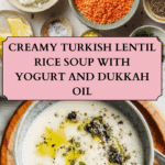 A creamy and comforting Turkish-style soup that combines tender red lentils, rice, and tangy yogurt, finished with a fragrant drizzle of dukkah-infused olive oil for an aromatic and flavorful experience.